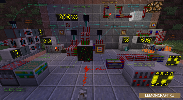 Модификация выводит работу с редстоун на качественно новый уровень, в игре появятся датчики для подсчета предметов, энергии и времени, светодиодные дисплеи и осциллографы, а также устройства для управления сигналами, включая компактные программируемые схемы.